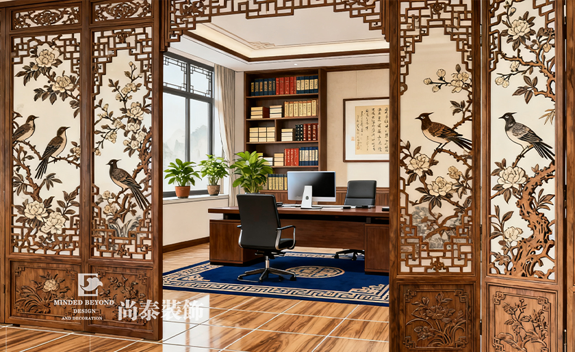 國風辦公室裝修需兼顧 “文化底蘊與功能實用”,尚泰裝飾擅長將傳統元素現代化。其經典方案為:墻面局部采用中式屏風(可定制公司文化圖案),其余區域刷朱砂紅或墨黑乳膠漆,地面鋪仿木紋瓷磚,搭配中式地毯。